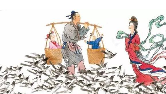 牛郎上天無(wú)路,還是老牛告訴牛郎,在它死后,可以用它的皮做成鞋,穿著就可以上天。牛郎按照老牛的話做了,穿上牛皮做的鞋,拉著自己的兒女,一起騰云駕霧上天去追織女,眼見(jiàn)就要追到了,豈知王母娘娘拔下頭上的金簪一揮,一道波濤洶涌的天河就出現(xiàn)了,牛郎和織女被隔在兩岸,只能相對(duì)哭泣流淚。他們的忠貞愛(ài)情感動(dòng)了喜鵲,千萬(wàn)只喜鵲飛來(lái),搭成鵲橋,讓牛郎織女走上鵲橋相會(huì),王母娘娘對(duì)此也無(wú)奈,只好允許兩人在每年七月七日于鵲橋相會(huì)。