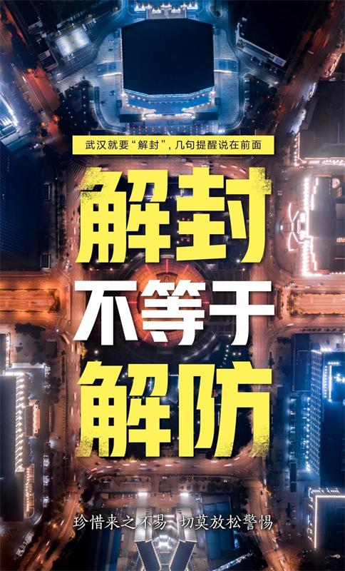 盼望著,盼望著,沉寂70多天后,白云黃鶴的故鄉(xiāng)終于解除了相對(duì)封閉的狀態(tài),九省通衢的武漢終于舒展出生龍活虎的樣子,所有的努力終于有了結(jié)果,但是,“解封”不是“解防”,我們依然還是要做好保護(hù)自己的防護(hù)措施,畢竟保護(hù)好自己,也是在保護(hù)他人,珍惜抗疫成果,珍惜來之不易,切莫放松警惕!