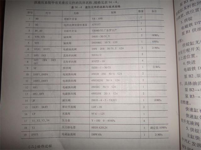 該液壓系統(tǒng)中有關(guān)液壓元件的具體名稱、規(guī)格見表14-4