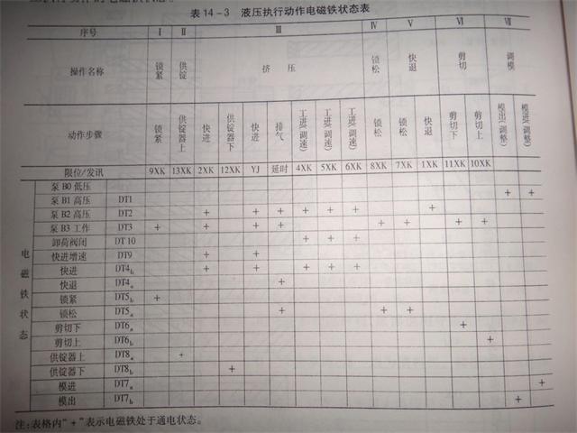 XJ630型銅鋁材擠壓機的液壓系統(tǒng)工作原理圖如14-3所示,表14-3為該機液壓執(zhí)行動作的電磁鐵狀態(tài)。